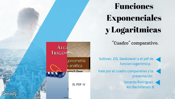 Definición: Esta es la funcion inversa a la exponencial, se denota por log(a)Elementos: Sea a un número real positivo diferente de 1. El logaritmo de x con base "a" esta definido por y=loga(x)Dennis, estas on firecuenta con gran variedad de ejemplos (15) y una cantidad cosiderable de ejercicios con los cuales el tema se puede entender a totalidad.Contiene gran cantidad de apoyo y puede usarse como ayuda o una mano para el PDF de funcion exponencial y logaritmica.