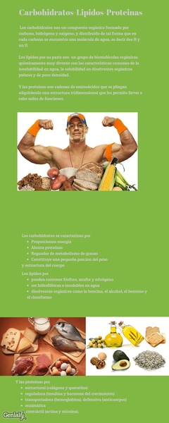 Los carbohidratos son un compuesto orgánico formado por carbono, hidrógeno y oxigeno, y distribuido de tal forma que en cada carbono se encuentra una molecula de agua, es decir dos H y un O. Los lipidos por su parte son un grupo de biomoléculas orgánicas químicamente muy diverso con las características comunes de la insolubilidad en agua, la solubilidad en disolventes orgánicos polares y de poco densidad. Y las proteinas son cadenas de aminoácidos que se pliegan adquiriendo una estructura tridimensional que les permite llevar a cabo miles de funciones.