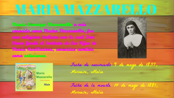 María Dominga Mazzarello o más conocida como Madre Mazzarello, fue una religiosa italiana con la cual Don Bosco fundó el Instituto de las Hijas de María Auxiliadora, conocidas también como salesianas.