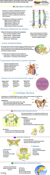 El raquis es un conjunto osteoarticular que sirve a la vez al armazon del cuerpo y proteccion a la medula espinal, que va desde la cabeza( a la cual sostiene) pasando por el cuello y la espalda hasta la pelvis a la cual le da soporte.constituida por 33 vertebras que se dividen en:
