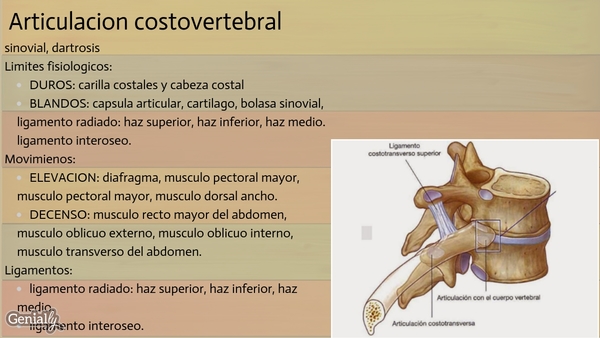 - BLANDOS: capsula articular, sinovial rudimentaria, ligamento interoseo, ligamento costotransverso superior, ligamento costotransverso inferior, ligamento costotransverso posterior, ligamento costolaminar.