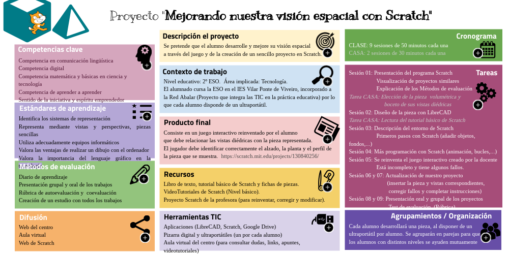 Sesión 01: Presentación del programa Scratch Visualización de proyectos similares Explicación de los Métodos de evaluación Tarea CASA: Elección de la pieza volumétrica y boceto de sus vistas diédricas Sesión 02: Diseño de la pieza con LibreCAD Tarea CASA: Lectura del tutorial básico de Scratch Sesión 03: Descripción del entorno de Scratch Primeros pasos con Scratch (añadir objetos, fondos,...) Sesión 04: Más programación con Scratch (animación, bucles,...) Sesión 05: Se reinventa el juego interactivo creado por la docente Está incompleto y tiene algunos fallos. Sesión 06 y 07: Actualización de nuestro proyecto (insertar la pieza y vistas correspondientes, corregir fallos y completar instrucciones) Sesión 08 y 09: Presentación oral y grupal de los proyectos Test de evaluación (Rúbrica)
