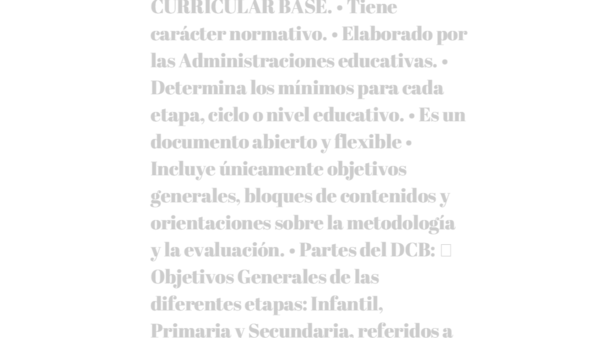 PRIMER NIVEL: DISEÑO CURRICULAR BASE. • Tiene carácter normativo. • Elaborado por las Administraciones educativas. • Determina los mínimos para cada etapa, ciclo o nivel educativo. • Es un documento abierto y flexible • Incluye únicamente objetivos generales, bloques de contenidos y orientaciones sobre la metodología y la evaluación. • Partes del DCB: Objetivos Generales de las diferentes etapas: Infantil, Primaria y Secundaria, referidos a las capacidades cognitivas, motrices, afectivas, de relación interpersonal y de inserción social. Las áreas curriculares. En Educación Infantil (Identidad y Autonomía Personal, Medio Físico y Social y Comunicación y Representación). En Educación Primaria (Lengua Castellana y Literatura, Matemáticas, Conocimiento del Medio, etc.). En E.S.O., la mayor parte de las áreas corresponden a una única disciplina. Objetivos generales de áreas: son las capacidades que se pretenden alcancen los alumnos al finalizar la etapa respecto a cada una de las áreas. Bloques de contenidos: son agrupaciones de contenidos a trabajar durante la etapa. Orientaciones metodológicas: papel del alumnado y el profesorado, tiempos, espacios, recursos etc... Orientaciones para la evaluación. B.- SEGUNDO NIVEL: PROYECTO CURRICULAR DE CENTRO Y PROYECTO EDUCATIVO DE CENTRO. Proyecto Educativo de Centro PEC. Define la identidad del centro y sirve para planificar a medio plazo. Proyecto Curricular del Centro PCC. Incluido en el PEC junto al Reglamento de Organización y Funcionamiento (R.O.F.). Elaborado por el equipo docente y aprobado por el claustro con la participación de todos los sectores de la comunidad educativa. El P.C.C proyecta a medio y largo plazo el conjunto de actuaciones didácticas del equipo docente de un Centro educativo, adecuadas a un contexto específico. C.- TERCER NIVEL: PROGRAMACIONES CURRICULARES DE AULA. Estrategias y actividades de enseñanza-aprendizaje que cada profesor/a, educador/a realiza con su alumnado, recogidos en unidades didácticas ordenadas y secuenciadas para las áreas de cada ciclo y/o nivel, en consonancia con el PCC y el DCB. En educación Infantil, son elaboradas por Técnicos/as Superiores en Educación Infantil y por Maestros/as de Educación Infantil. En primaria por Maestros/as de Educación Primaria. En ESO por los profesores/as de cada especialidad, guiados por la propuesta de cada departamento. D.- CUARTO NIVEL . ADAPTACIONES CURRICULARES. Algunos autores/as consideran las Adaptaciones Curriculares como un cuarto nivel de concreción, así como todas las medidas de atención a la diversidad. Son elaboradas por el equipo pedagógico, profesores/as de pedagogía terapéutica, maestras/os de educación especial y técnicos/as superiores integración social.