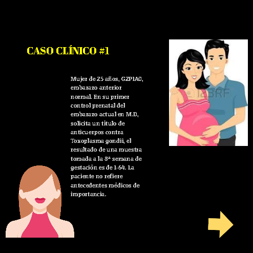 Mujer de 25 años, G2P1A0, embarazo anterior normal. En su primer control prenatal del embarazo actual en M.D, solicita un título de anticuerpos contra Toxoplasma gondii, el resultado de una muestra tomada a la 8ª semana de gestación es de 1:64. La paciente no refiere antecedentes médicos de importancia.