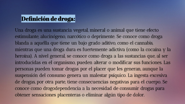 Una droga es una sustancia vegetal, mineral o animal que tiene efecto estimulante, alucinógeno, narcótico o deprimente. Se conoce como droga blanda a aquélla que tiene un bajo grado aditivo, como el cannabis, mientras que una droga dura es fuertemente adictiva (como la cocaína y la heroína). A nivel general, se conoce como droga a las sustancias que, al ser introducidas en el organismo, pueden alterar o modificar sus funciones. Las personas pueden tomar drogas por el placer que les generan, aunque la suspensión del consumo genera un malestar psíquico. La ingesta excesiva de drogas, por otra parte, tiene consecuencias negativas para el cuerpo. Se conoce como drogodependencia a la necesidad de consumir drogas para obtener sensaciones placenteras o eliminar algún tipo de dolor.