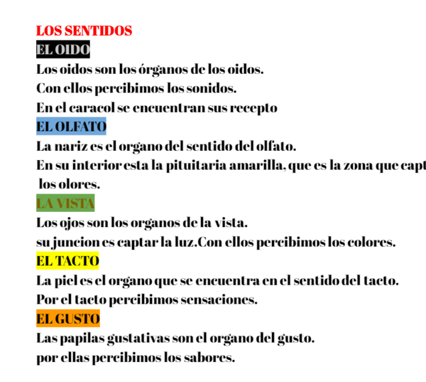 LOS SENTIDOSEL OIDO Los oidos son los órganos de los oidos.Con ellos percibimos los sonidos. En el caracol se encuentran sus recepto EL OLFATO La nariz es el organo del sentido del olfato. En su interior esta la pituitaria amarilla, que es la zona que capta los olores. LA VISTA Los ojos son los organos de la vista. su juncion es captar la luz.Con ellos percibimos los colores. EL TACTO La piel es el organo que se encuentra en el sentido del tacto. Por el tacto percibimos sensaciones. EL GUSTO Las papilas gustativas son el organo del gusto. por ellas percibimos los sabores.