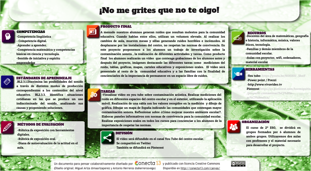 A menudo nuestros alumnos generan ruidos que resultan molestos para la comunidad educativa. Cuando hablan entre ellos, utilizan un volumen elevado. Al realizar los cambios de aula, mueven mesas y sillas generando ruidos horribles e incómodos. Al desplazarse por las instalaciones del centro, no respetan las normas de convivencia. En este proyecto proponemos a los alumnos un trabajo de investigación sobre la contaminación sonora , la realización de diferentes actividades y tareas. Como producto final los alumnos realizarán un video que contenga grabaciones de los alumnos antes y después del proyecto, imágenes destacando las diferentes tareas como mediciones del ruido, tablas, gráficas, mapas, carteles educativos y exposiciones orales. El video será presentado al resto de la comunidad educativa y a las familias con la finalidad de concienciarles de la importancia de permanecer en un espacio libre de ruidos.