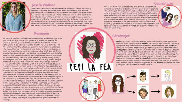 Pepi la fea es un libro chistoso lleno de aventuras y experiencias contadas con el humor de Josefa, sin duda quien lo lea no podrá no reírse, sus hojas llenos de chilenismos y chites ñoños que simularan como si una amiga te estuviera contando la historia, las hojas se te pasan volando y no te das cuenta cuando llegas al final y quedas con el gusto de seguir leyendo. Destacar también a la protagonista que más de alguno se puede sentir identificado con ella, y con la mala suerte que suele tener, o los pensamientos o situaciones que le suceden, y que enamora su actitud de cuando quiere defenderse, sin dejar que nadie la haga sentir en menos, sin duda una historia para releer mil veces más.