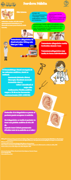 Sintomatología: Pérdida auditiva de moderada a severa afecta la mayoría a 1 solo oído, suele aparecer en min u horas. Se acompañada de Acúfenos (ruido en el oído)Vértigo, Otalgía (dolor) y cefálea