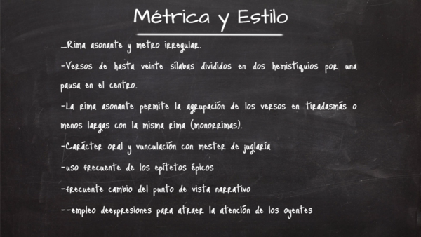 _Rima asonante y metro irregular. -Versos de hasta veinte sílabas divididos en dos hemistiquios por una pausa en el centro. -La rima asonante permite la agrupación de los versos en tiradasmás o menos largas con la misma rima (monorrimas). -Carácter oral y vunculación con mester de juglaría -Uso frecuente de los epítetos épicos -Frecuente cambio del punto de vista narrativo -Empleo de expresiones para atraer la atención de los oyentes
