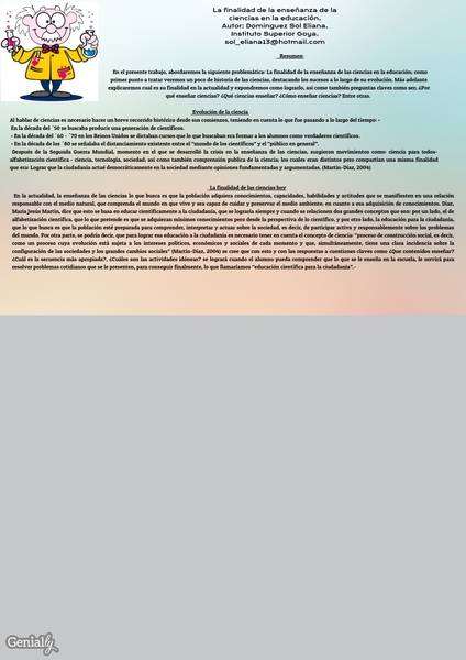 La finalidad de la enseñanza de la ciencias en la educación.Autor: Dominguez Sol Eliana. Instituto Superior Goya. sol_eliana13@hotmail.com
