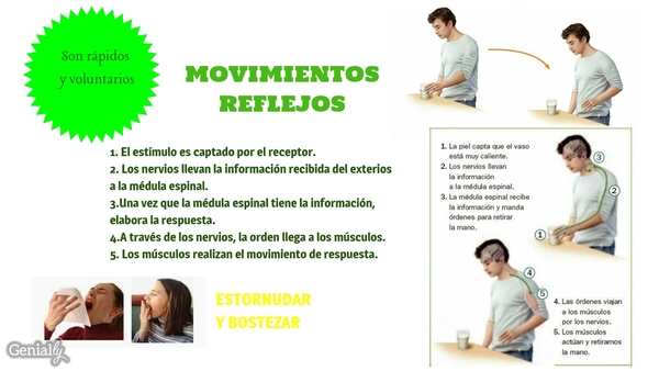 1. El estímulo es captado por el receptor.2. Los nervios llevan la información recibida del exterios a la médula espinal. 3.Una vez que la médula espinal tiene la información, elabora la respuesta. 4.A través de los nervios, la orden llega a los músculos. 5. Los músculos realizan el movimiento de respuesta.