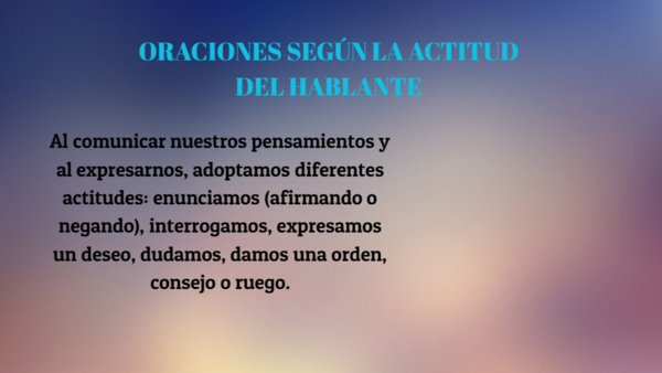 Al comunicar nuestros pensamientos y al expresarnos, adoptamos diferentes actitudes: enunciamos (afirmando o negando), interrogamos, expresamos un deseo, dudamos, damos una orden, consejo o ruego.