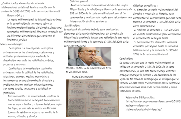 Objetivo general: Analizar la teoría tridimensional del derecho, según Miguel Reale y la relación que tiene con la sentencia C-355 del 2006 de la corte constitucional, con el fin comprender y analizar esta teoría para así, obtener una interpretación de dicha sentencia.