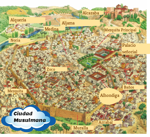 Las ciudades del mundo árabe los edificios se apiñaban en la medina que era el centro de la ciudad musulmana. Formado por un laberinto de calles estrechas para protegerse del calor y muchas de ellas sin salida. En el interior de la medina se encuentran el zoco o mercado, la alcazaba o recinto fortificado, de los hammams o baños públicos y la mezquita o lugar de culto. Alrededor de la medina se situaban los arrabales o barrios periféricos.