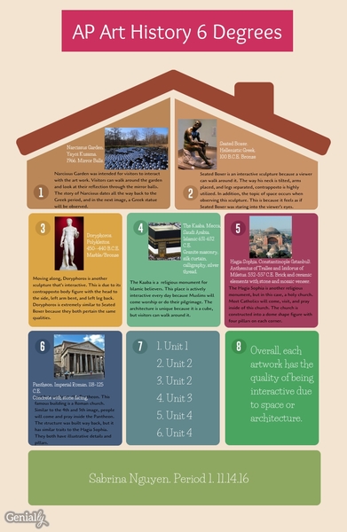 Moving along, Doryphoros is another sculpture that's interactive. This is due to its contrapposto body figure with the head to the side, left arm bent, and left leg back. Doryphoros is extremely similar to Seated Boxer because they both pertain the same qualities.