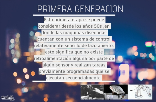 Esta primera etapa se puede considerar desde los años 50s ,en donde las maquinas diseñadas cuentan con un sistema de control relativamente sencillo de lazo abierto, esto significa que no existe retroalimentación alguna por parte de algún sensor y realizan tareas previamente programadas que se ejecutan secuencialmente.