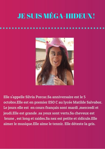 Elle s'appelle Silvia Porcar.Sa anniversaire est le 5 octobre.Elle est en premier ESO C au lycée Matilde Salvabor. Le jours elle est en cours français sont mardi ,mercredi et jeudi.Elle est grande .sa yeux sont verts.Sa cheveux est brune , est long et raides.Sa nez est petite et ridicule.Elle aimer le musique.Elle aime le tennir. Elle déteste la gris.