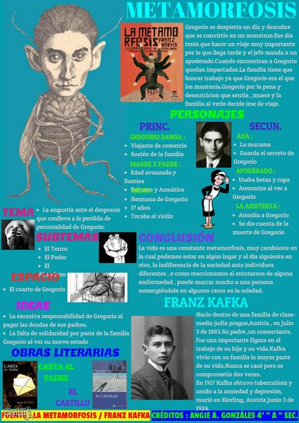Gregorio se despierta un día y descubre que se convirtío en un monstruo.Ese dia tenia que hacer un viaje muy importante por lo que llega tarde y el jefe manda a un apoderado.Cuando encuentran a Gregorio quedan impactados.La familia tiene que buscar trabajo ya que Gregorio era el que los mantenía.Gregorio por la pena y desnutricion que sentía , muere y la familia al verlo decide irse de viaje.