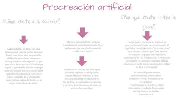 - Sin embargo, la procreación artificial separa la procreación del acto conyugal. Se pierde el sentido de la procreación como entrega mutua del hombre y la mujer y como alianza de amor.