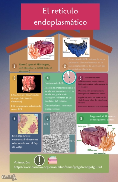 Exiten 2 tipos: el RER (rugoso, con ribosomas) y el REL (liso, sin ribosomas)