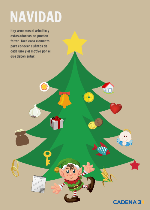 Hoy armamos el arbolito y estos adornos no pueden faltar. Tocá cada elemento para conocer cuántos de cada uno y el motivo por elque deben estar.