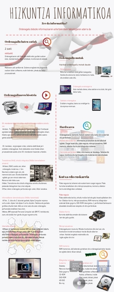 Irudiak digitalizatzeko periferikoakEskanerra Eskanerra datuak sartzeko gailu bat da, eta formatu digitala ematen die paperean inprimatutako irudiei, pantailan ikusteko eta ordenagailu bidez tratatzeko. 1. CCD deritzon mosaiko bat dute. Mosaiko hori argiarekiko sentikorra da. Lanpara bat ere badute. Lanpara gainazal batean mugitzen da eta argi egiten dio orriari. 2.Lanpararen argiak paperean argi egiten du, eta paperean dagoena CCD mosaikoan islatzen da. Mosaikoak puntu fotosentifikorrezko matrize bat du; hau da, puntu horiek aktibatu egiten dira argi egitean. Hortaz, puntu horiek bihurtzen dute irudia irudi digital. 3. Eskanerrak USB atakaren bidez konektatzen dira ordenagailura. Eskaner zaharrak ataka paralelo bidez konektatzen dira. 4.Kalitatea neurtzeko, hazbeteko digitaliza dezakeen puntu kopurua (bereizmena) hartzen da kontuan. Bereizmena zenbat eta handiagoa den, kalitatea hobea izango da. Bi zenbakiren bidez adieratzen da bereizmena: batek bereizmen bertikala adierazten du, eta besteak, horizontala. 5. Irudia, digital bihurtu ostean, argazkiei ukituak emateko aplikazio baten edo marrazketa-aplikazio baten bidez trata daiteke; besteak beste, Paint eta Gimp aplikazioen bidez. Irudiak digitalizatzeko periferikoak Kamera digitalak Kamera digitalen bidez, argazkiak atera eta fitxategi digialetan gorde ditzakezu zuzenean, ohiko argazki-film negatibo bat edo diapositiba-film bat erabili gabe. Bideokamera digitalak Mugitzen ari diren irudiak digitalizatzeko gai dira bideokamera digitalak. Gailu autonomoak dira eta ordenagailu batetik urrun funtziona dezakete. Internetera konektatzeko periferikoak Internet informatika-sare ikaragarria da, mundu osoko milioika ordenagailu konektatzen ditu. Internetera sartzeko, hardware bat behar dugu. Modema Modemak seinale digitala modulatu eta analogiko bihurtzen du, eta alderantziz. Gure modemak gure Internet-hornitzailearen modemarekin hitz egiten du, informazioa transmititzeko. Bideratzailea Bideratzailearen bidez, hainbat ordenagailu elkarren artean konekta ditzakegu eta, aldi berean, Internetera ere konekta ditzakegu. Beste periferiko batzuk Ordenagailura konektatu eta ordenagailuaren funtzionaltasunak osatzen edo handitzen dituzten gailu guztiak ere periferikotzat hartu behar dira. -Web kamerak erabiliz, bideokonferentziakegin ditzakegu Interr bidez. -Memoria eramangarri txikien bidez, eunka megabyte edo hainbat gigabyte gorde daitezke toki txiki batean. -Taula grafikoei esker, eroso.eroso marraz dezakegu pantailan