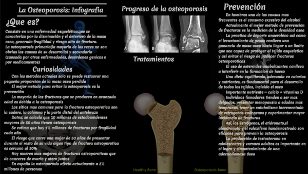 Consiste en una enfermedad esquelética,que se caracteriza por la disminución y el deterioro de la masa osea, generado fragilidad y riesgo alto de fractura.La osteoporosis primaria(la mayoria de las veces no son obvias las causas de su desarrollo) y secundaria (causada por otras enfermedades, desordenes genicos o por medicamentos)