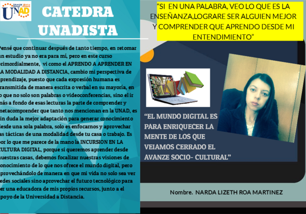 Pensé que continuar después de tanto tiempo, en retomar un estudio ya no era para mí, pero en este curso primordialmente, vi como el APRENDO A APRENDER EN LA MODALIDAD A DISTANCIA, cambio mi perspectiva de aprendizaje, puesto que cada expresión humana es transmitida de manera escrita o verbal en su mayoría, en lo que no solo son palabras o videoconferencias, sino el ir más a fondo de esas lecturas la parte de comprender y metacomprender que tanto nos mencionan en la UNAD, es sin duda la mejor adaptación para generar conocimiento desde una sola palabra, solo es enfocarnos y aprovechar las tácticas de una modalidad desde tu casa o trabajo. Es por lo que me parece de la mano la INCURSION EN LA CULTURA DIGITAL, porque si queremos aprender desde nuestras casas, debemos focalizar nuestras visiones de conocimiento de lo que nos ofrece el mundo digital, pero aprovechándolo de manera en que mi vida no solo sea ver redes sociales sino aprovechar el futuro tecnológico para ser una educadora de mis propios recursos, junto a el apoyo de la Universidad a Distancia.