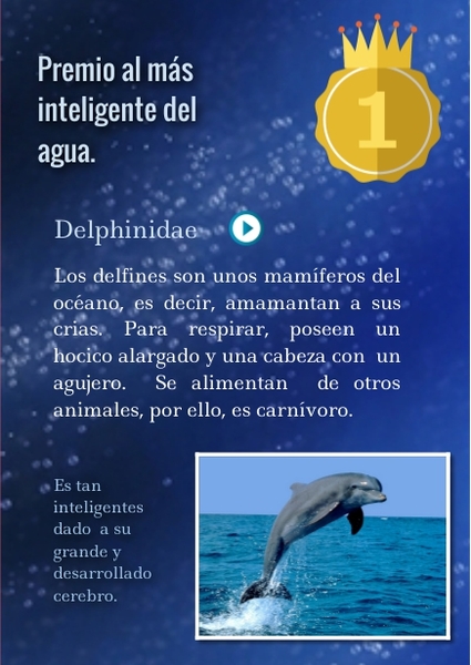 Los delfines son unos mamíferos del océano, es decir, amamantan a sus crias. Para respirar, poseen un hocico alargado y una cabeza con un agujero. Se alimentan de otros animales, por ello, es carnívoro.