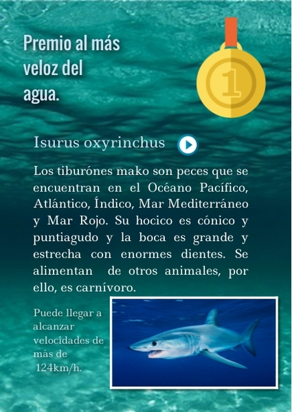 Los tiburónes mako son peces que se encuentran en el Océano Pacífico, Atlántico, Índico, Mar Mediterráneo y Mar Rojo. Su hocico es cónico y puntiagudo y la boca es grande y estrecha con enormes dientes. Se alimentan de otros animales, por ello, es carnívoro.