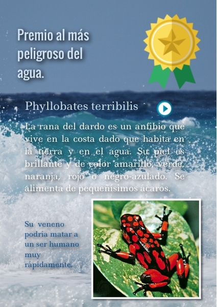 La rana del dardo es un anfibio que vive en la costa dado que habita en la tierra y en el agua. Su piel es brillante y de color amarillo, verde, naranja, rojo o negro-azulado. Se alimenta de pequeñísimos ácaros.