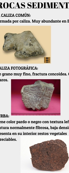 TURBA:Tiene color pardo o negro con textura leñosa, textura normalmente fibrosa, baja densidad y presenta en su interior restos vegetales apreciables.