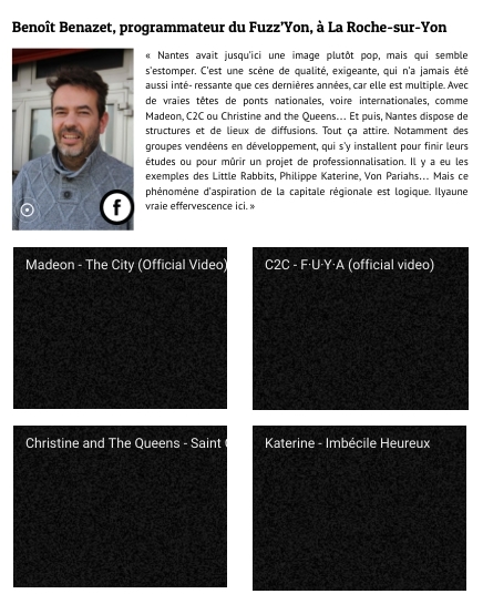 « Nantes avait jusqu’ici une image plutôt pop, mais qui semble s’estomper. C’est une scène de qualité, exigeante, qui n’a jamais été aussi inté- ressante que ces dernières années, car elle est multiple. Avec de vraies têtes de ponts nationales, voire internationales, comme Madeon, C2C ou Christine and the Queens… Et puis, Nantes dispose de structures et de lieux de diffusions. Tout ça attire. Notamment des groupes vendéens en développement, qui s’y installent pour finir leurs études ou pour mûrir un projet de professionnalisation. Il y a eu les exemples des Little Rabbits, Philippe Katerine, Von Pariahs… Mais ce phénomène d’aspiration de la capitale régionale est logique. Ilyaune vraie effervescence ici. »