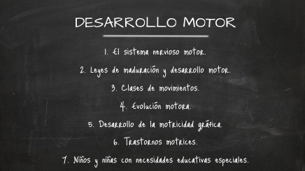 1. El sistema nervioso motor. 2. Leyes de maduración y desarrollo motor. 3. Clases de movimientos. 4. Evolución motora. 5. Desarrollo de la motricidad gráfica. 6. Trastornos motrices. 7. Niños y niñas con necesidades educativas especiales.