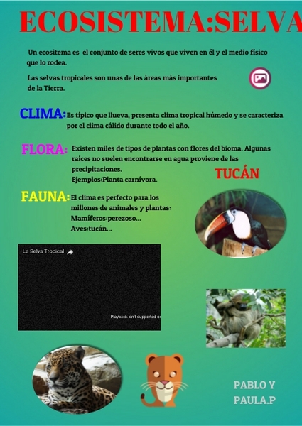 El clima es perfecto para los millones de animales y plantas:Mamíferos:perezoso... Aves:tucán...