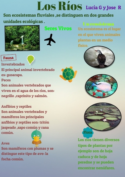 InvertebradosEl principal animal invertebrado es: gusarapa.Peces Son animales vertebrados que viven en el agua de los ríos, son: negrillo ,caprinito y salmón. Anfibios y reptilesSon animales vertebrados y mamíferos los principales anfibios y reptiles son: tritón jaspeado ,sapo común y rana común. Aves Son mamíferos con plumas y se distingue este tipo de ave: la focha común.