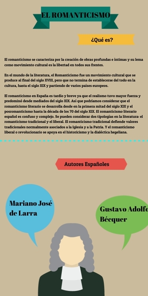 El romanticismo se caracteriza por la creación de obras profundas e íntimas y su lema como movimiento cultural es la libertad en todos sus frentes.En el mundo de la literatura, el Romanticismo fue un movimiento cultural que se produce al final del siglo XVIII, pero que no termina de establecerse del todo en la cultura, hasta el siglo XIX y partiendo de varios países europeos.El romanticismo en España es tardío y breve ya que el realismo tuvo mayor fuerza y predominó desde mediados del siglo XIX. Así que podríamos considerar que el romanticismo literario se desarrolla desde en la primera mitad del siglo XIX y el posromanticismo hasta la década de los 70 del siglo XIX. El romanticismo literario español es confuso y complejo. Se pueden considerar dos tipologías en la literatura: el romanticismo tradicional y el liberal. El romanticismo tradicional defiende valores tradicionales normalmente asociados a la Iglesia y a la Patria. Y el romanticismo liberal o revolucionario se apoya en el historicismo y la dialéctica hegeliana.