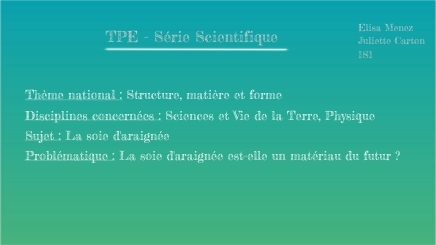 Thème national : Structure, matière et forme Disciplines concernées : Sciences et Vie de la Terre, Physique Sujet : La soie d'araignée Problématique : La soie d'araignée est-elle un matériau du futur ?