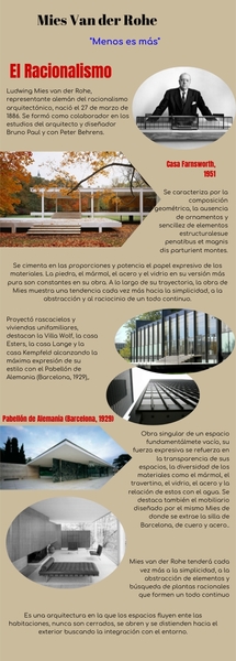Ludwing Mies van der Rohe, representante alemán del racionalismo arquitectónico, nació el 27 de marzo de 1886. Se formó como colaborador en los estudios del arquitecto y diseñador Bruno Paul y con Peter Behrens.