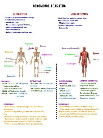 HEZURRAK:- HEZUR LUZEAK: Adib. Izterrezurra. * Muturra edo epifisia. * Erdiko zatia edo diafisia. - HEZUR MOTZAK: Adib. Ornoak. - HEZUR LAUAK: Adib. Garezurraren hezurrak.