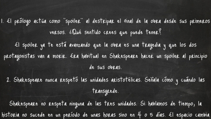 1. El prólogo actúa como ''spoiler'' al destripar el final de la obra desde sus primeros versos. ¿Qué sentido crees que puede tener? El spoiler ya te está avanzando que la obra es una tragedia y que los dos protagonistas van a morir. Era habitual en Shakespeare hacer un spoiler al principio de sus obras. 2. Shakespeare nunca respetó las unidades aristotélicas. Señala cómo y cuándo las transgrede. Shakespeare no respeta ninguna de las tres unidades. Si hablamos de tiempo, la historia no sucede en un período de unas horas sino en 4 o 5 días. El espacio cambia constantemente (aparecen el balcón de Julieta, la celda de Fray Lorenzo, la calle, etc). Si hablamos de acción, no solo hay una, existe la vida que las familias de Romeo y Julieta creen que llevan y luego las vidas que los amados realmente llevan.