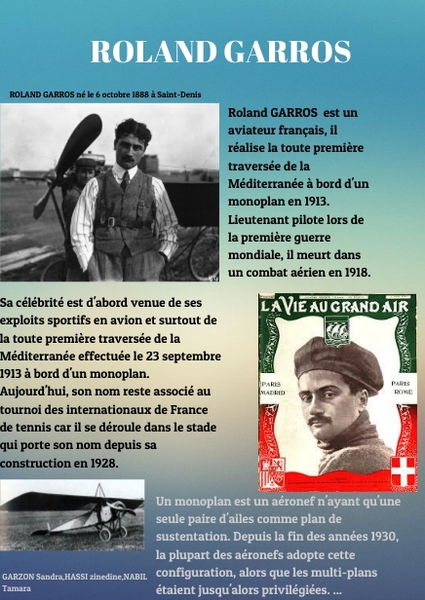 Roland GARROS est un aviateur français, il réalise la toute première traversée de la Méditerranée à bord d'un monoplan en 1913. Lieutenant pilote lors de la première guerre mondiale, il meurt dans un combat aérien en 1918.