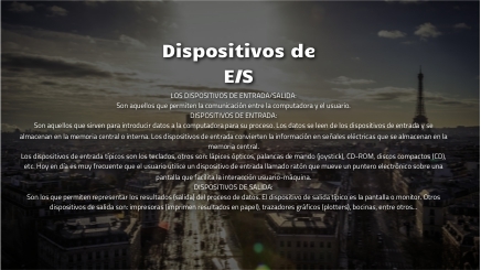 LOS DISPOSITIVOS DE ENTRADA/SALIDA:Son aquellos que permiten la comunicación entre la computadora y el usuario.DISPOSITIVOS DE ENTRADA:Son aquellos que sirven para introducir datos a la computadora para su proceso. Los datos se leen de los dispositivos de entrada y se almacenan en la memoria central o interna. Los dispositivos de entrada convierten la información en señales eléctricas que se almacenan en la memoria central.Los dispositivos de entrada típicos son los teclados, otros son: lápices ópticos, palancas de mando (joystick), CD-ROM, discos compactos (CD), etc. Hoy en día es muy frecuente que el usuario utilice un dispositivo de entrada llamado ratón que mueve un puntero electrónico sobre una pantalla que facilita la interacción usuario-máquina.DISPOSITIVOS DE SALIDA:Son los que permiten representar los resultados (salida) del proceso de datos. El dispositivo de salida típico es la pantalla o monitor. Otros dispositivos de salida son: impresoras (imprimen resultados en papel), trazadores gráficos (plotters), bocinas, entre otros...