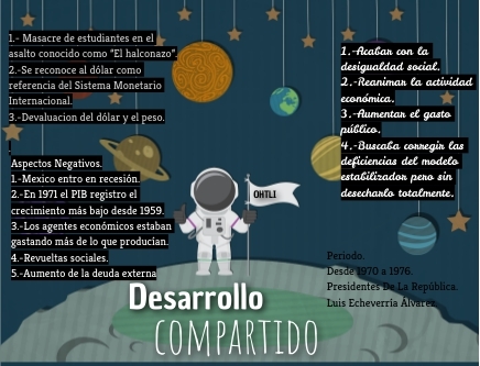 Aspectos Negativos.1.-Mexico entro en recesión.2.-En 1971 el PIB registro el crecimiento más bajo desde 1959.3.-Los agentes económicos estaban gastando más de lo que producían.4.-Revueltas sociales.5.-Aumento de la deuda externa