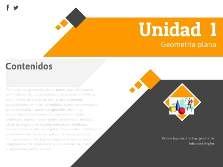 Definición de geometría, plano, punto, posición relativa punto-plano, figuras geométricas, recta, posición relativa punto-recta, de dos rectas en el plano, segmentos, proposiciones, axiomas, postulados, teoremas y corolarios, proporcionalidad, razón y proporción, términos, propiedades, operaciones con segmentos, ángulos, definición, representación gráfica, unidades de medida, clases de ángulos, rectas perpendiculares, mediatriz, bisectriz, propiedades de ángulos, dos paralelas cortadas por una transversal, triángulos, polígonos, líneas y puntos fundamentales del triángulos, ángulos de los triángulos, congruencia, triángulos rectángulos, semejanza, postulados y propiedades del baricentro.