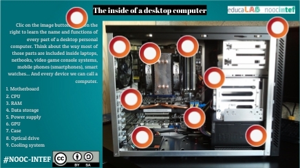 Clic on the image buttons ( ) on the right to learn the name and functions of every part of a desktop personal computer. Think about the way most of those parts are included inside laptops, netbooks, video game console systems, mobile phones (smartphones), smart watches... And every device we can call a computer.
