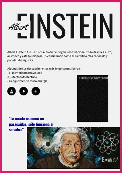 Albert Einstein fue un físico alemán de origen judío, nacionalizado después suizo, austriaco y estadounidense. Es considerado como el científico más conocido y popular del siglo XX. Algunos de sus descubrimientos más importantes fueron: - El movimiento Browniano -El efecto fotoeléctrico - La equivalencia masa-energía