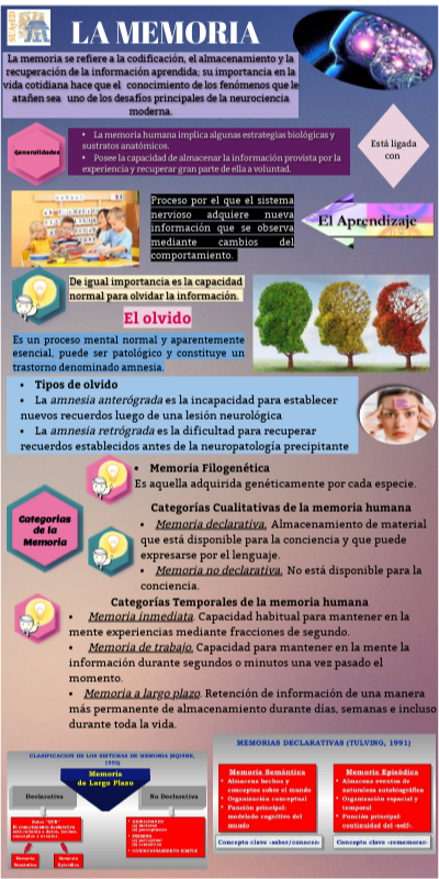 La memoria se refiere a la codificación, el almacenamiento y la recuperación de la información aprendida; su importancia en la vida cotidiana hace que el conocimiento de los fenómenos que le atañen sea uno de los desafíos principales de la neurociencia moderna.