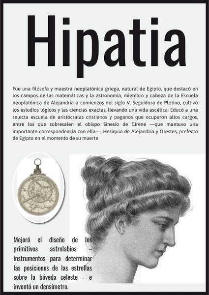 Fue una filósofa y maestra neoplatónica griega, natural de Egipto, que destacó en los campos de las matemáticas y la astronomía, miembro y cabeza de la Escuela neoplatónica de Alejandría a comienzos del siglo V. Seguidora de Plotino, cultivó los estudios lógicos y las ciencias exactas, llevando una vida ascética. Educó a una selecta escuela de aristócratas cristianos y paganos que ocuparon altos cargos, entre los que sobresalen el obispo Sinesio de Cirene —que mantuvo una importante correspondencia con ella—, Hesiquio de Alejandría y Orestes, prefecto de Egipto en el momento de su muerte